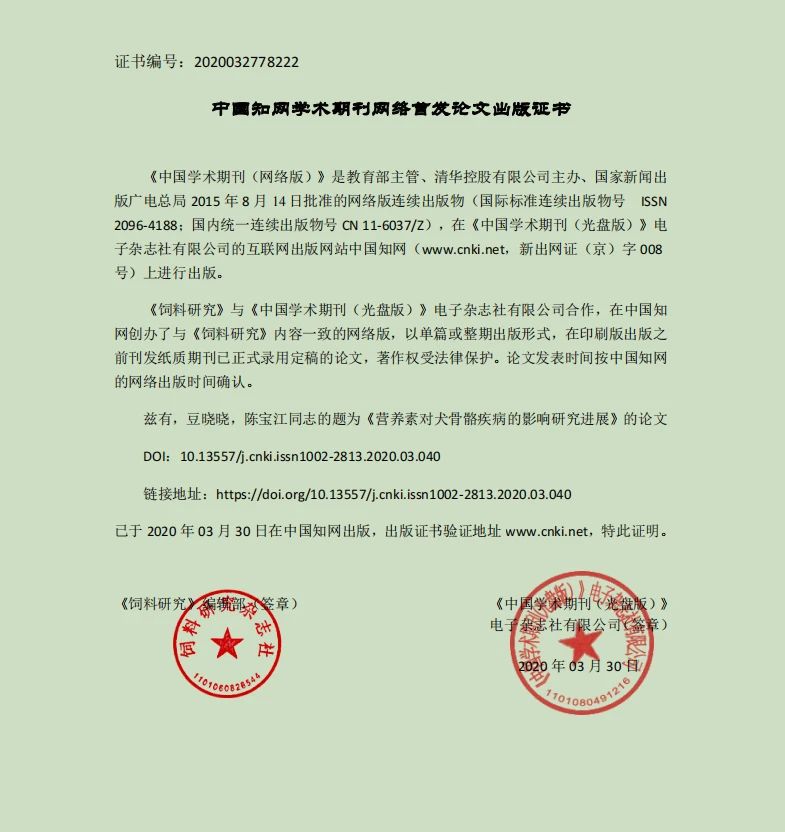 華興寵物食品研發(fā)部論文《營養(yǎng)素對犬骨骼疾病的影響研究進(jìn)展》在北大核心期刊《飼料研究》上發(fā)表,并可在中國知網(wǎng)上檢索。